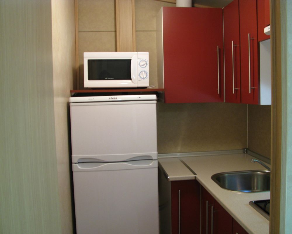 Todo lo que necesitas: nevera, microondas, encimera de gas y menaje completo.